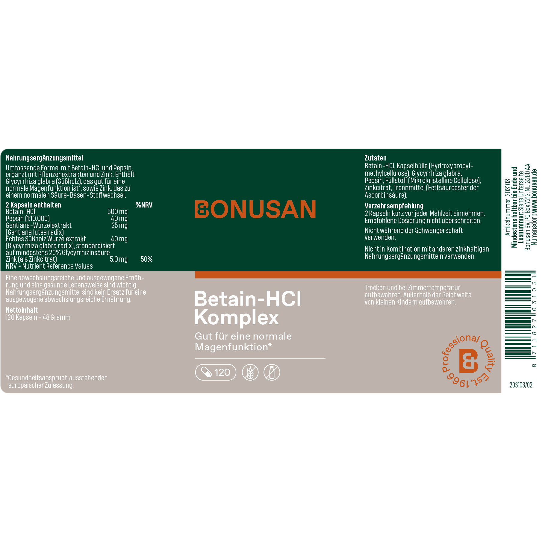 Bonusan Betain-HCl Komplex kombiniert Betain-HCl mit Pepsin (1:10.000), einem Verdauungsenzym mit hoher Enzymaktivität. Das bedeutet, dass ein Teil Pepsin unter den richtigen Bedingungen (wie einer ausreichend sauren Magenumgebung) in der Lage ist, 10.000 Teile Protein abzubauen. Dank dieser hohen Aktivität ist Pepsin schon in kleinen Mengen wirksam. Darüber hinaus enthält das Produkt eine sorgfältig zusammengestellte Mischung aus Kräuterextrakten, darunter Enzian (Gentiana lutea) und Süßholzwurzel (Glycyrrhiza glabra). Süßholz wird traditionell zur Unterstützung des Erhalts eines normalen Säuregehalts im Magen* verwendet. Zink wurde unter anderem wegen seines anerkannten Beitrags zum Erhalt eines normalen Säure-Basen-Gleichgewichts hinzugefügt.