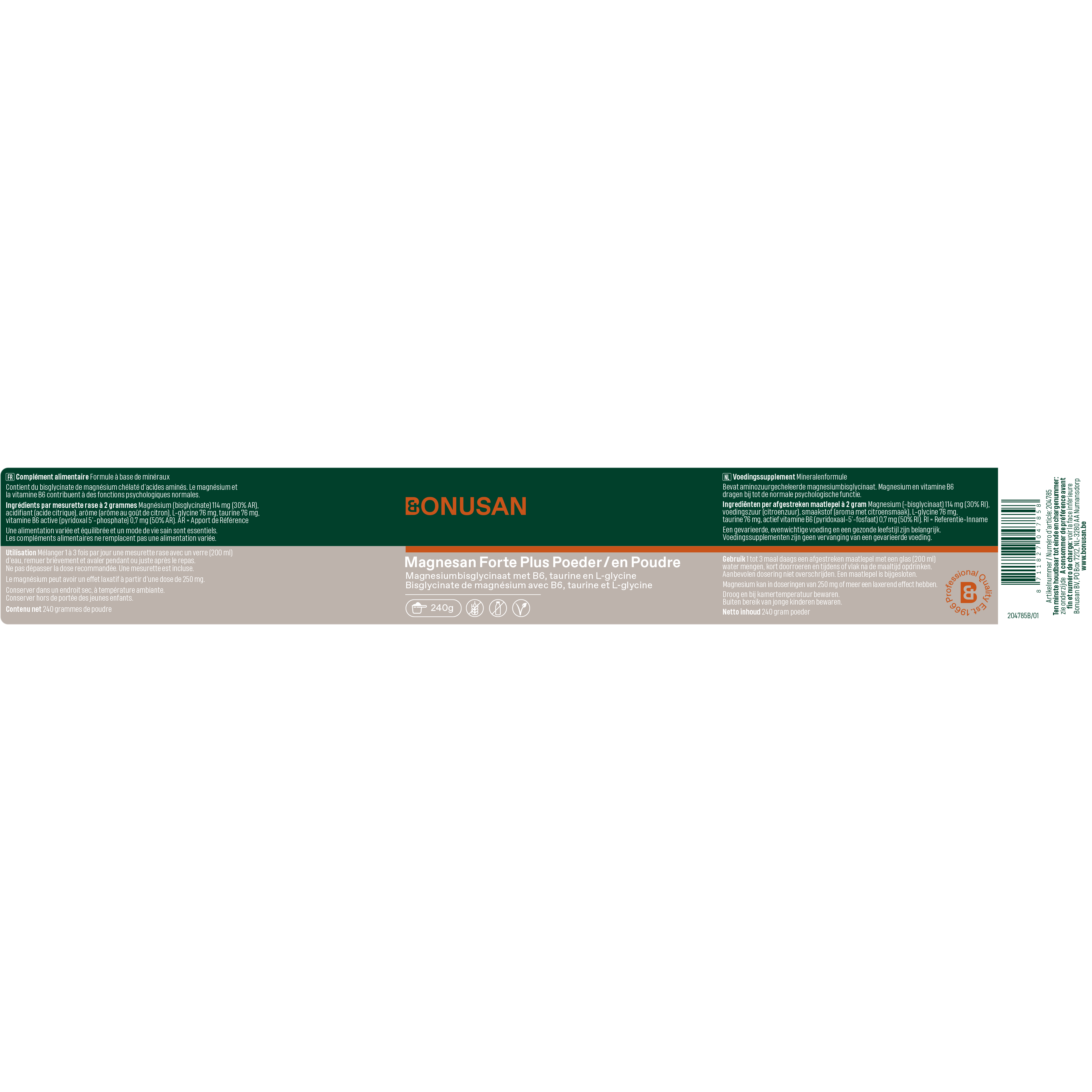 Magnesan Forte plus poeder is al ruim 20 jaar een van de populairste Bonusan producten onder gezondheidsprofessionals. Eén maatschepje Magnesan Forte plus levert 114 mg elementair magnesium. Elementair betekent dat je lichaam deze 114 mg volledig kan gebruiken. Bovendien bevat het product uitsluitend zeer goed opneembaar bisglycinaat en is het volledig vrij van moeilijk opneembaar magnesiumoxide. De hoge kwaliteit magnesium is aangevuld met de belangrijke cofactoren vitamine B6, L-glycine en taurine. Zoals je van ons gewend bent bevat dit product geen onnodige toevoegingen zoals kunstmatige kleur-, geur- en smaakstoffen.