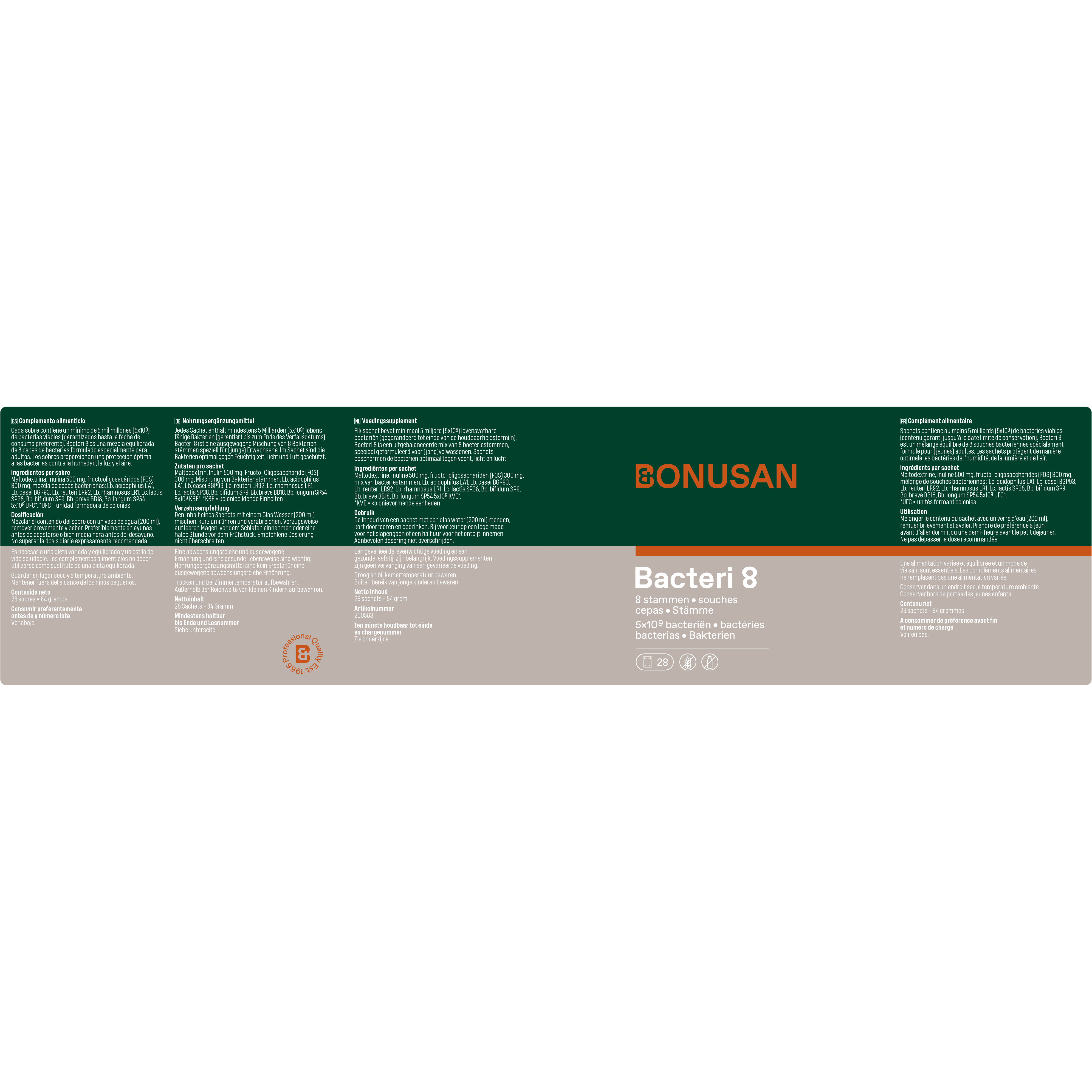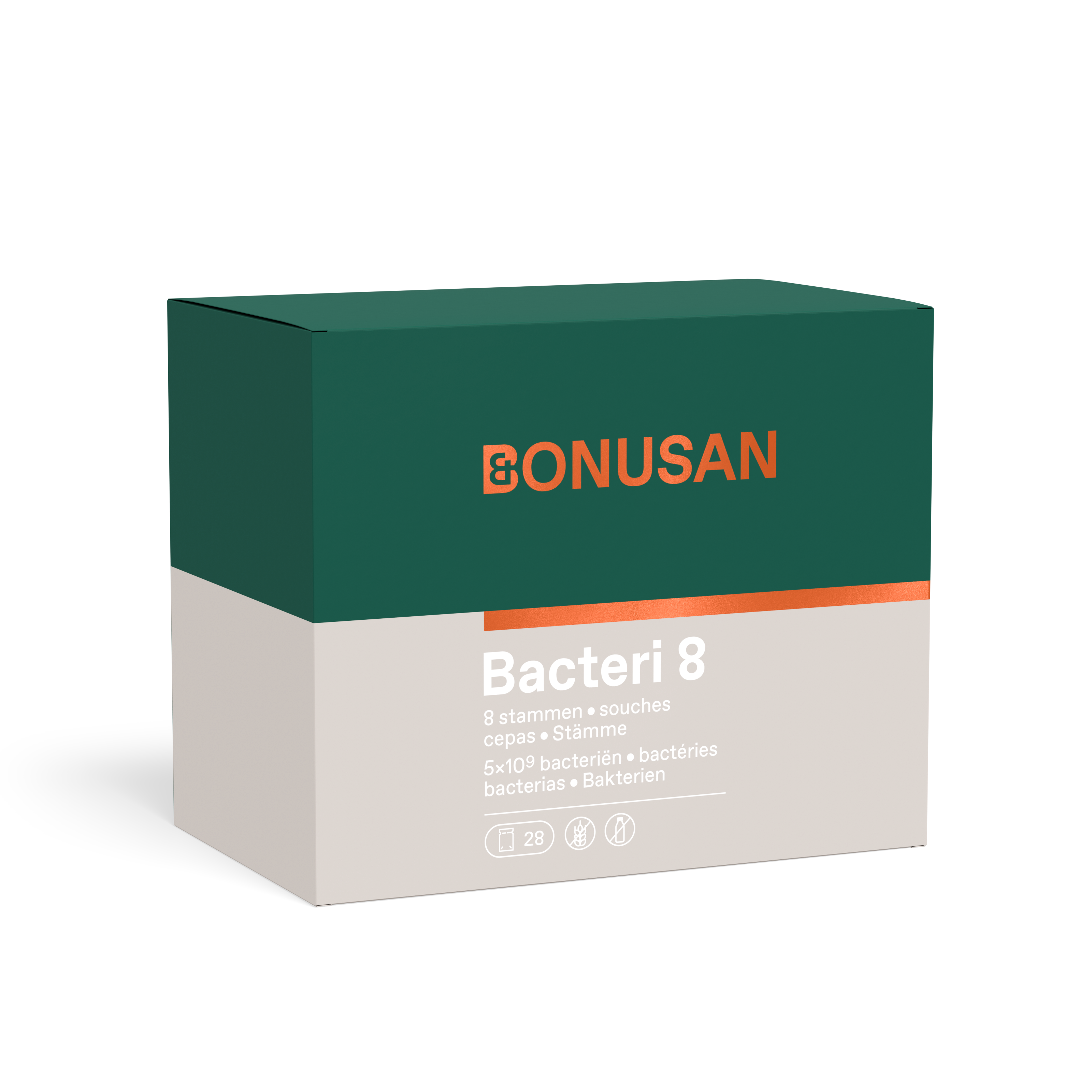 Bonusan Bacteri 8 bevatten 8 wetenschappelijk onderzochte bacteriestammen die van nature in onze darmen voorkomen. De stammen zijn zorgvuldig geselecteerd op hun overlevingskracht in het spijsverteringskanaal. Dit zorgt ervoor dat een hoog percentage bacteriën de darm levend bereikt. Bovendien overdoseren we op het moment van productie, waardoor je per sachet tot het eind van de houdbaarheidstermijn gegarandeerd minimaal 5 miljard levensvatbare bacteriën (KVE) binnenkrijgt.