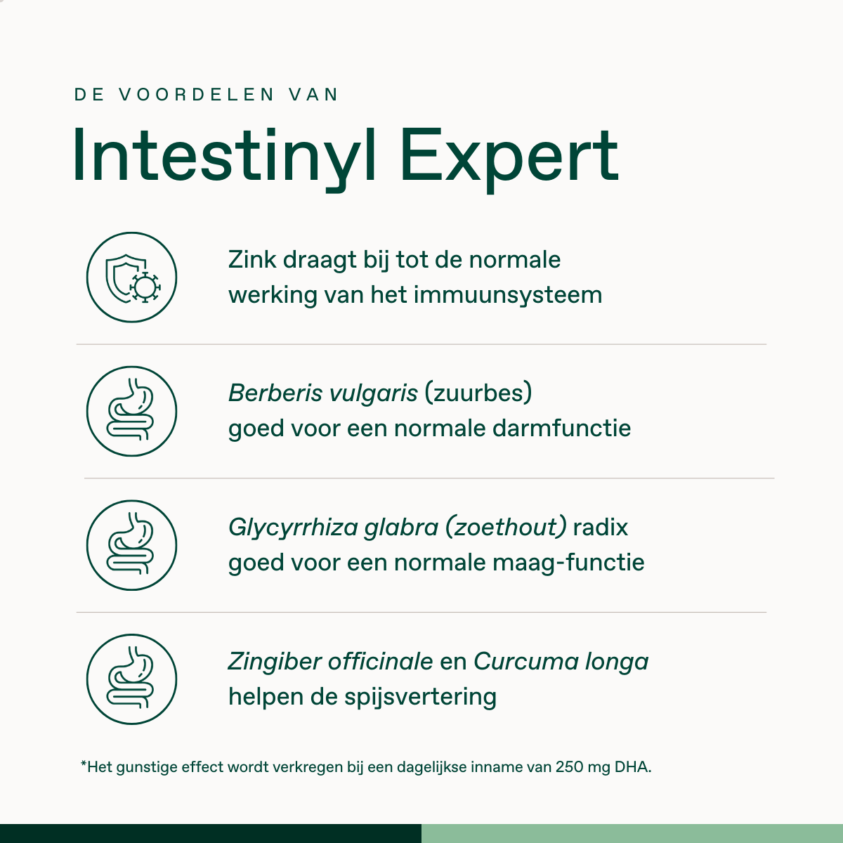 Intestinyl Expert is een alles-in-één supplement dat bijdraagt tot een normale darmfunctie* (dankzij zuurbes, Berberis vulgaris). Het bevat bovendien gember (Zingiber officinale), dat de spijsvertering helpt* en zoethout (Glycyrrhiza glabra) dat goed is voor een normale maagfunctie*. We kunnen wel stellen dat Intestinyl Expert zorgt voor een goed buikgevoel . De overige ingrediënten werken als synergist en ondersteunen jouw dagelijkse routine, zoals: