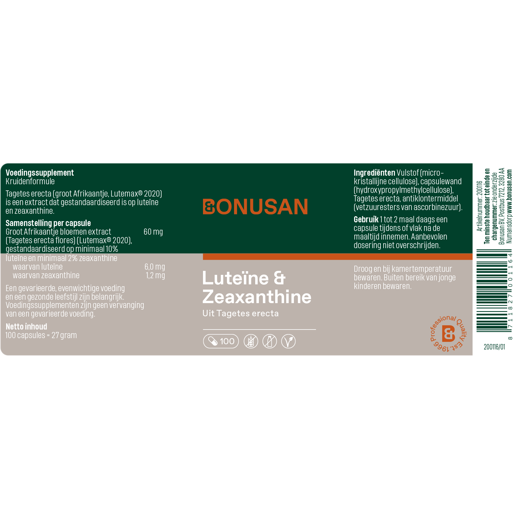 Bonusan Luteïne & Zeaxanthine bevat een natuurlijk extract van het groot Afrikaantje (Tagetes erecta). Door te werken met een gestandaardiseerd extract is de samenstelling per capsule constant. Bonusan Luteïne & Zeaxanthine heeft geen overbodige toevoegingen en past binnen een doordachte en transparante supplementkeuze.