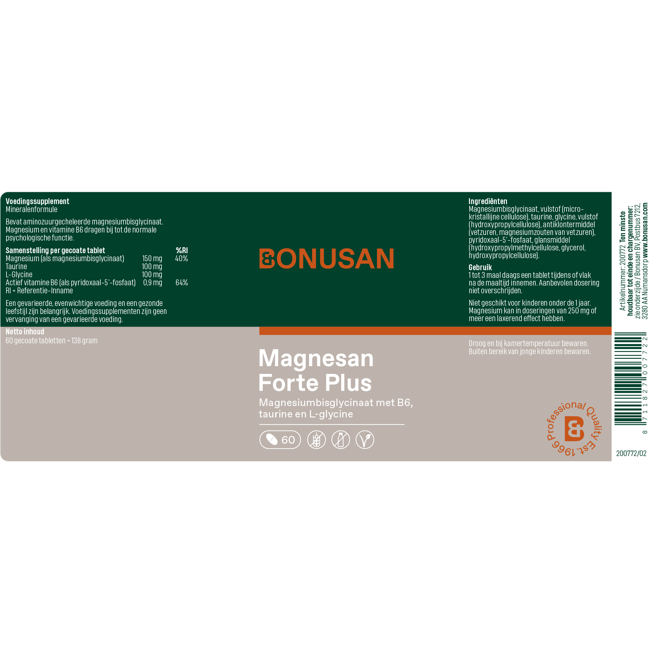 Magnesan Forte plus is al ruim 20 jaar een van de populairste Bonusan producten onder gezondheidsprofessionals. Eén tablet Magnesan Forte plus bevat 150 mg elementair magnesium. Elementair betekent dat je lichaam deze 150 mg volledig kan gebruiken. Bovendien bevat het product uitsluitend zeer goed opneembaar bisglycinaat en is het volledig vrij van moeilijk opneembaar magnesiumoxide. De hoge kwaliteit magnesium is aangevuld met de belangrijke cofactoren vitamine B6, L-glycine en taurine. Zoals je van ons gewend bent bevat dit product geen onnodige toevoegingen zoals kleur-, geur- en smaakstoffen.