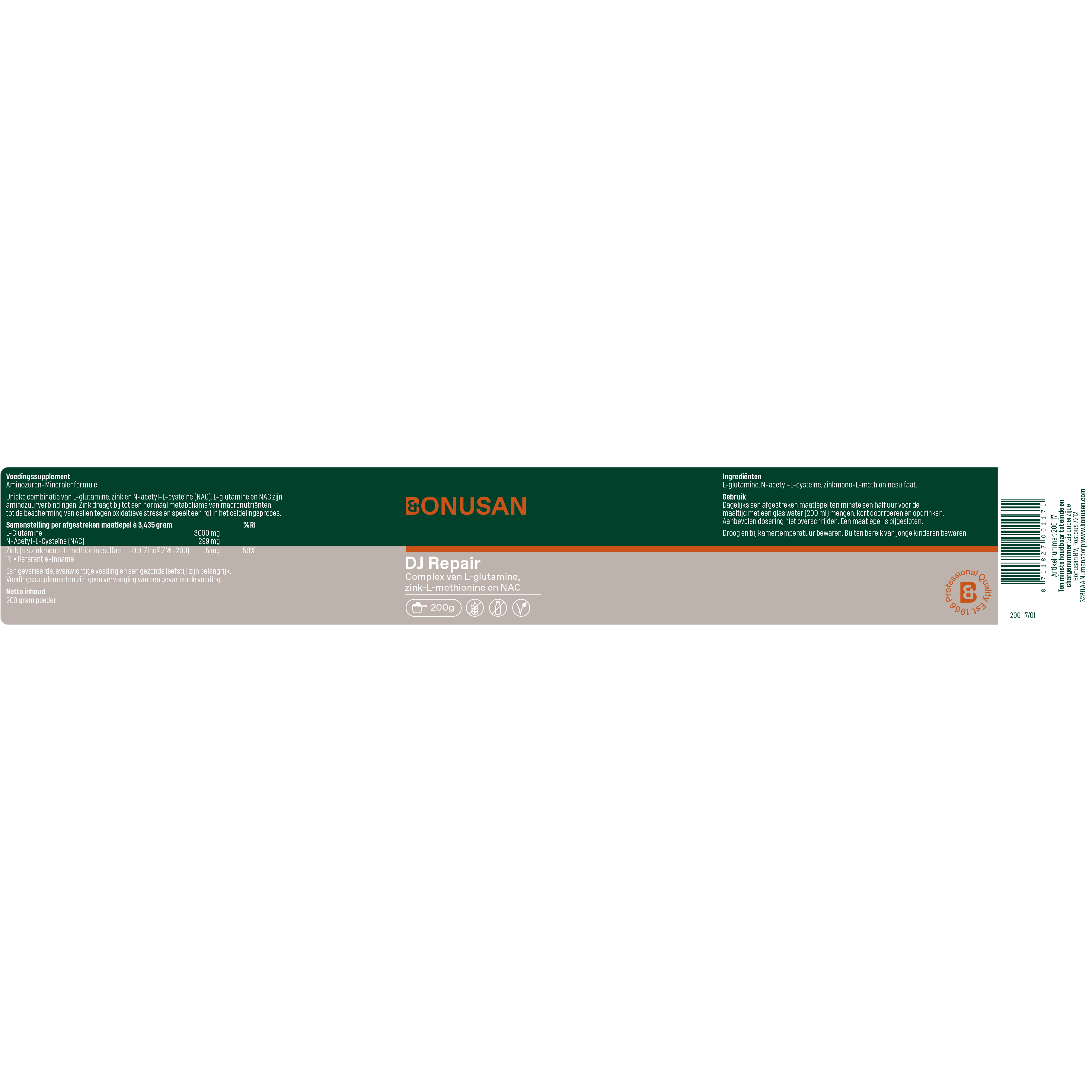 L-glutamine, N-acetyl-L-cysteïne, zinkmono-L-methioninesulfaat.