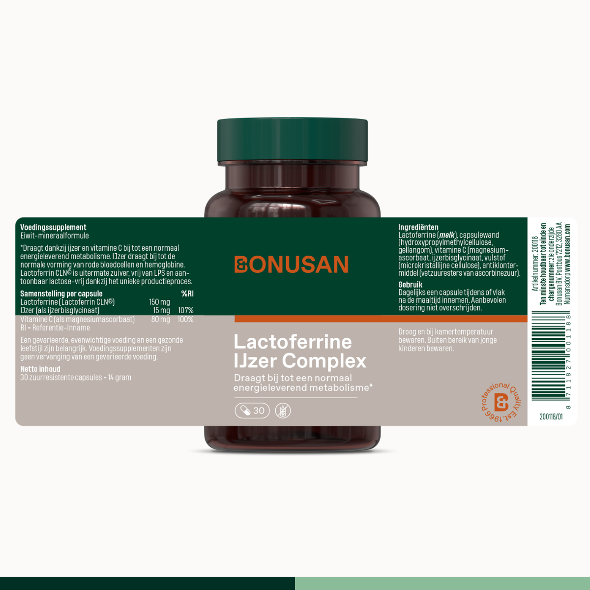 Bij een verhoogde behoefte aan ijzer, zoals tijdens menstruatie of zwangerschap, kan extra ijzer nuttig zijn. Lactoferrine IJzer Complex combineert lactoferrine met goed opneembaar ijzerbisglycinaat en vitamine C. Het ijzer in dit complex draagt bij tot de normale vorming van rode bloedcellen en hemoglobine en draagt bij tot een normaal zuurstoftransport in het lichaam. Vitamine C verhoogt de ijzeropname. Samen ondersteunen deze nutriënten jouw energiestofwisseling en dagelijkse vitaliteit. Waarom Bonusan Lactoferrine IJzer Complex?