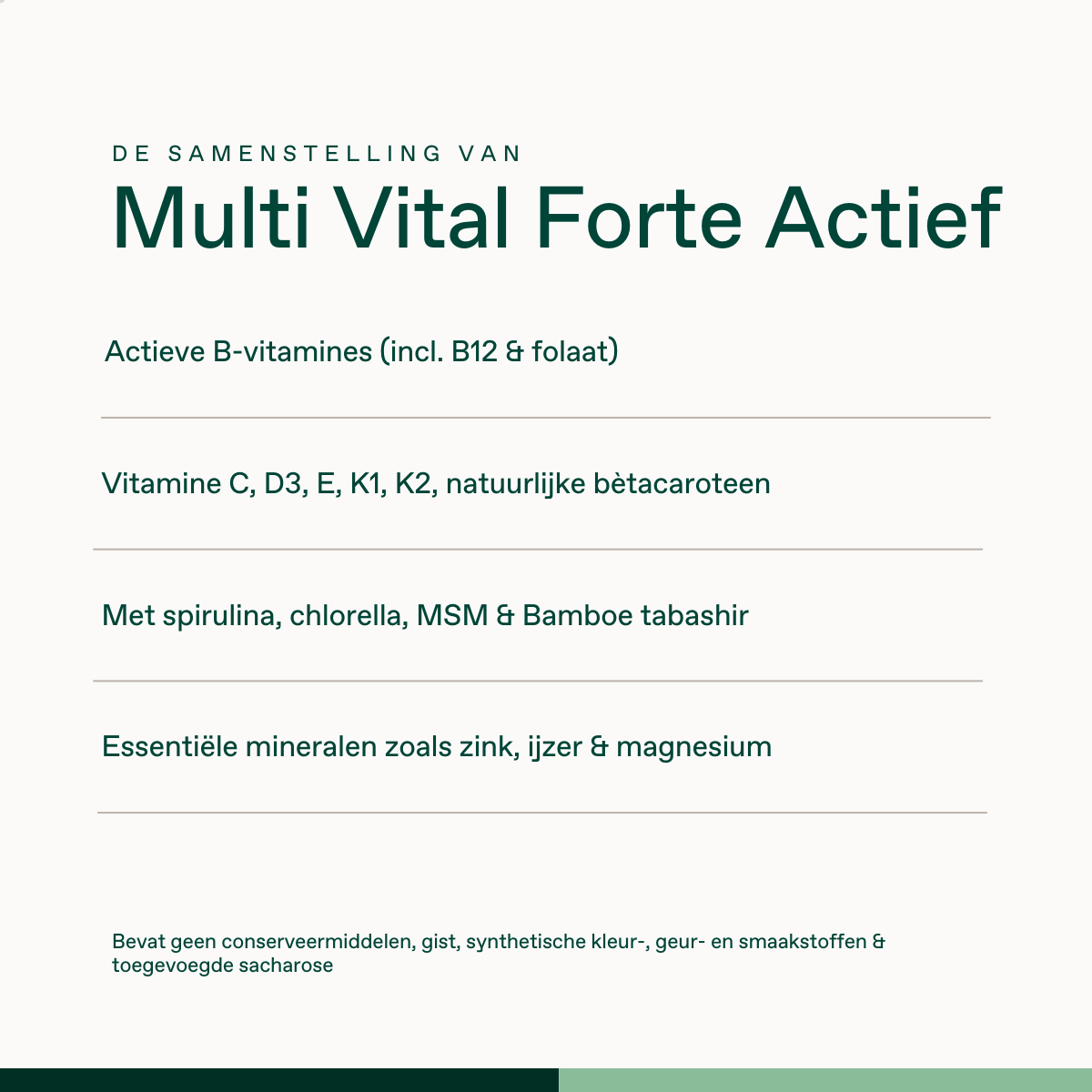 Magnesiumcarbonaat, capsulewand (hydroxypropylmethylcellulose), natuurlijke gemengde tocoferolen, calciumascorbaat, magnesiumascorbaat, nicotinamide, zinkcitraat, D-alfa-tocoferylwaterstofsuccinaat, bètacaroteen, calcium-D-pantothenaat, rijstextract, Chlorella pyrenoidosa, Spirulina platensis, cholinebitartraat, inositol, riboflavine, Laminaria digitata (kelp), thiaminehydrochloride, methylsulfonylmethaan, seleno-L-methionine, citrusbioflavonoïden, ijzerfumaraat, Bambusa arundinacea, para-aminobenzoëzuur, menaquinon-7, natriumboraat, vitamine B6 (pyridoxaal-5'-fosfaat), cholecalciferol, koperbisglycinaat, mangaancitraat, D-biotine, chroompicolinaat, fyllochinon, foliumzuur, (6S)-5-methyltetrahydrofoliumzuur/glucosaminezout, adenosylcobalamine, methylcobalamine, ammoniummolybdaat.