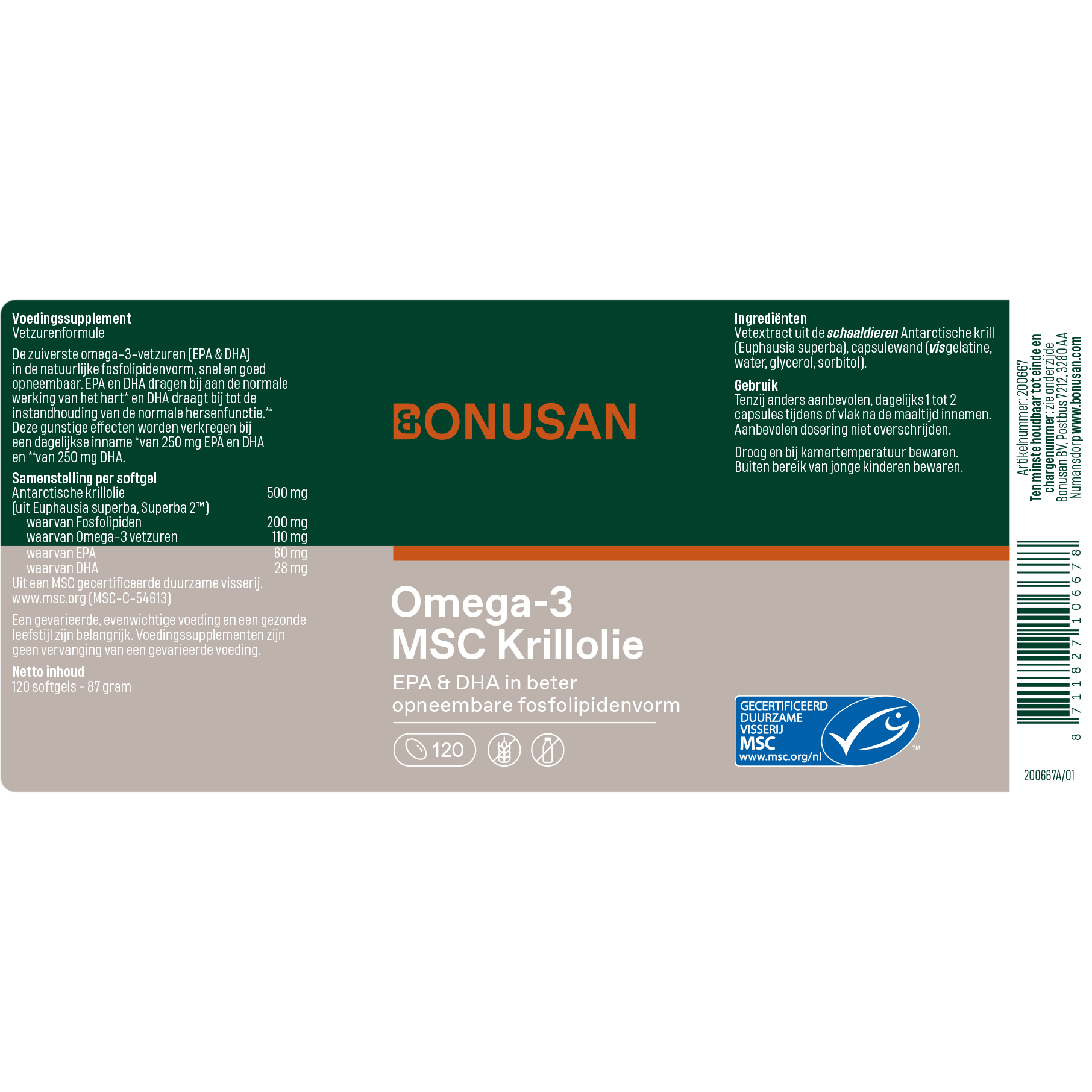 Krillolie wordt gewonnen uit Antarctische krill. Dit zijn kleine garnaalachtige schaaldiertjes die laag in de voedselketen staan en daarom de schoonste vetzuren bieden die minimaal bewerkt en gezuiverd hoeven te worden. Krillolie is een goede leverancier van de omega-3 vetzuren EPA en DHA. Anders dan in vis komen EPA en DHA in krill voor in fosfolipidenvorm. Door deze speciale fosfolipidestructuur worden vetzuren in deze vorm tot zes keer beter opgenomen in de darm. Je hebt dus minder van krillolie nodig om hetzelfde effect te bereiken dan van visolie. Dit betekent dat de 60 mg EPA en 28 mg DHA in een Bonusan Omega-3 Krillolie softgel gelijk staan aan 360 mg EPA en 168 DHA in visolie. Daardoor verhoog je met een relatief kleine hoeveelheid gemakkelijk je dagelijkse inname.