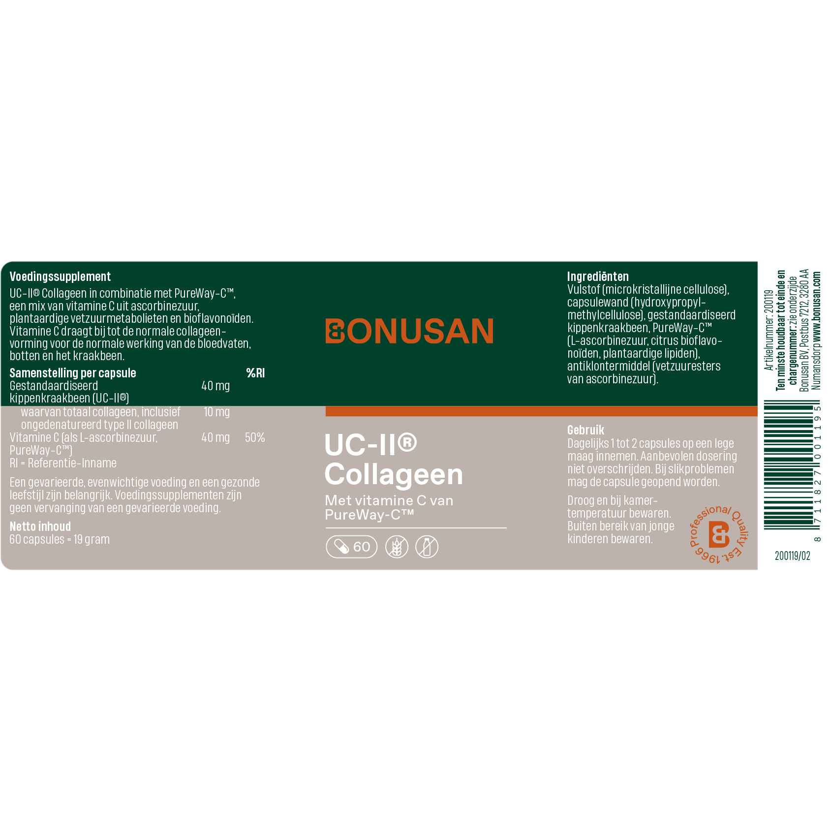Vulstof (microkristallijne cellulose), capsulewand (hydroxypropylmethylcellulose), gestandaardiseerd kippenkraakbeen, PureWay-C™ (L-ascorbinezuur, citrus bioflavonoïden, plantaardige lipiden), antiklontermiddel (vetzuuresters van ascorbinezuur).