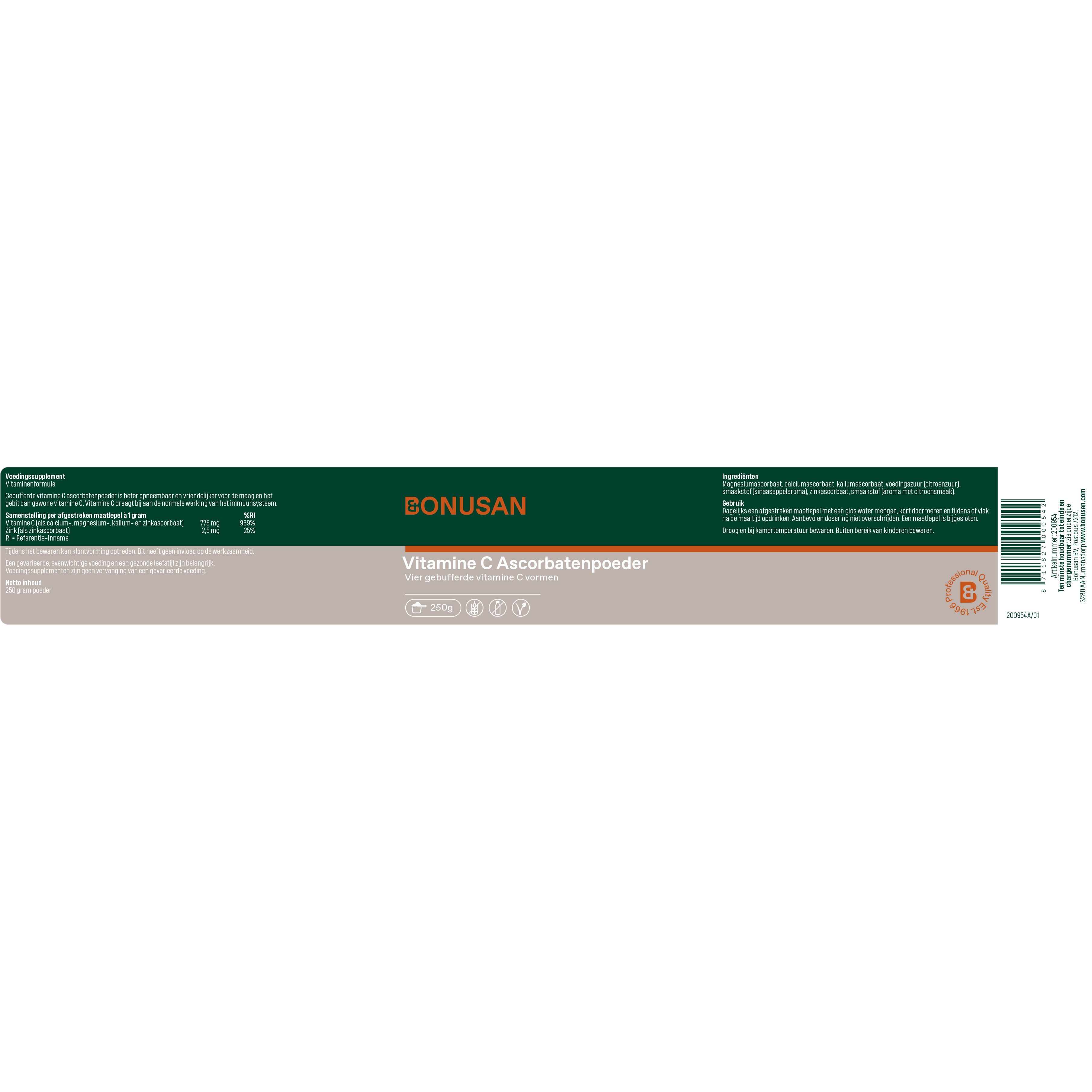 Bonusan Vitamine C ascorbatenpoeder bevat gebufferde vitamine C gebonden aan vier verschillende mineralen: calcium, magnesium, kalium en zink. Deze verbindingen worden ascorbaten genoemd. De mineraalascorbaten zijn in de verhouding zoals ze van nature voorkomen in het lichaam. Zo blijf je dicht bij de lichaamseigen mineraalbalans. Door deze binding levert het poeder ook een kleine hoeveelheid aan mineralen.