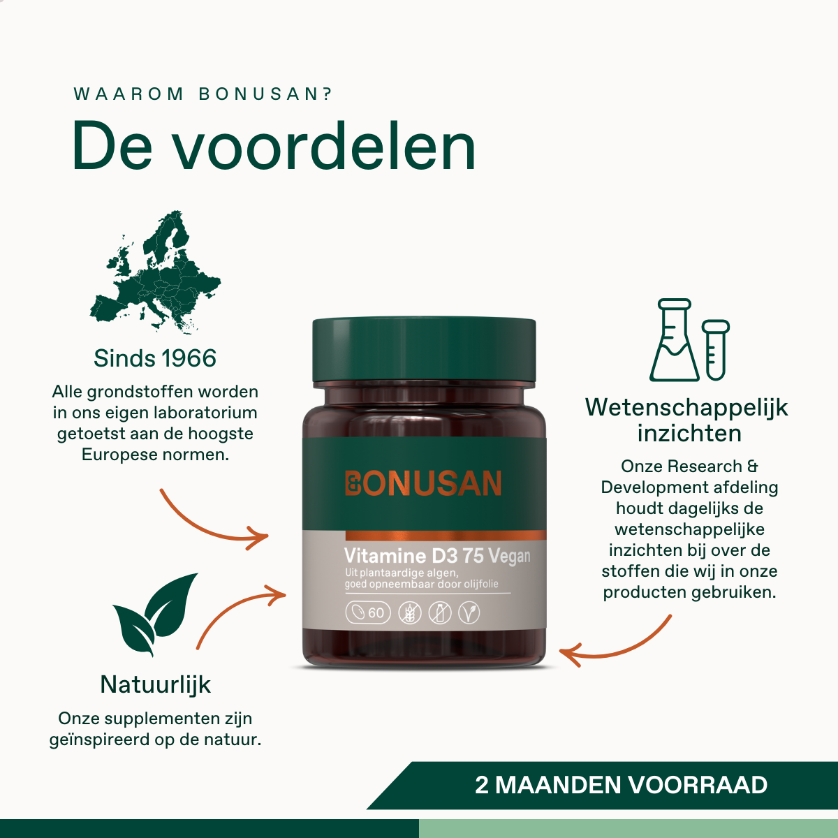 - Ontwikkeld door gezondheidsprofessionals: Bonusan Vitamine D3 75 Vegan werd ontwikkeld op basis van wetenschappelijk onderzoek.