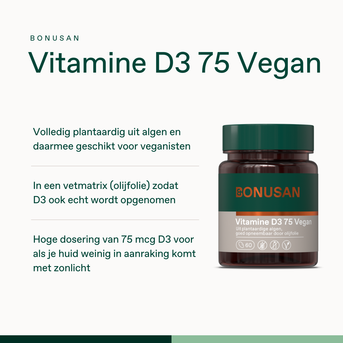 Ja, de Bonusan Vitamine D3 75 Vegan is net zo effectief als Bonusan Vitamine D3 75. Beide D3 supplementen komen in de vorm van cholecalciferol, de biologische vorm die ook door je eigen lichaam in de huid wordt aangemaakt onder invloed van zonlicht.