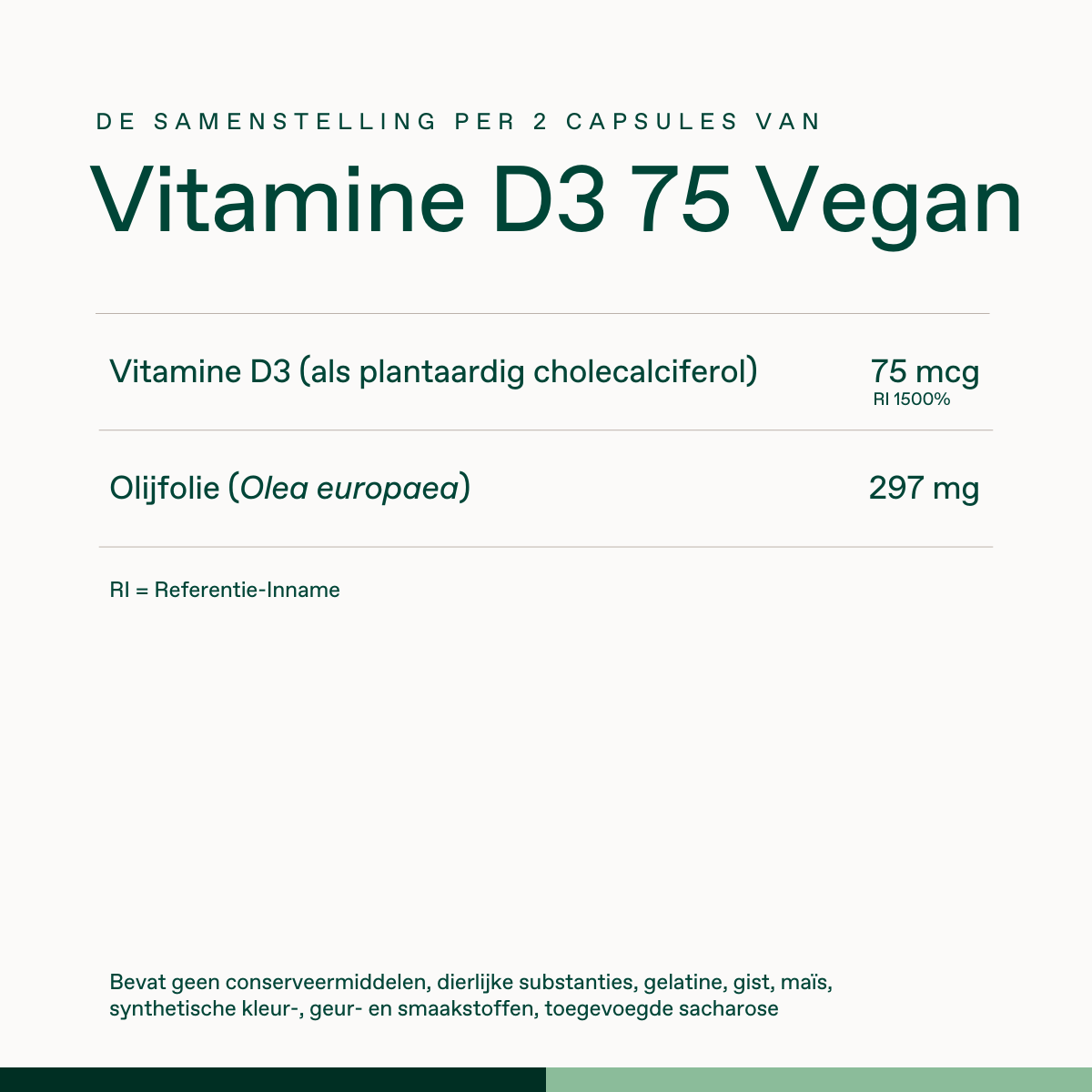 Vitamine D draagt onder andere bij aan de normale werking van het immuunsysteem en de instandhouding van normale botten en tanden. Vitamine D3 75 Vegan bevat 75 microgram (3000 IE) vitamine D3 uit plantaardige algen. Dankzij de krachtige dosering en de basis van olijfolie profiteer je van een goed opneembare vorm van vitamine D, geschikt voor dagelijks gebruik. Zo vul je je D3 behoefte effectief en verantwoord aan, op volledig plantaardige wijze.